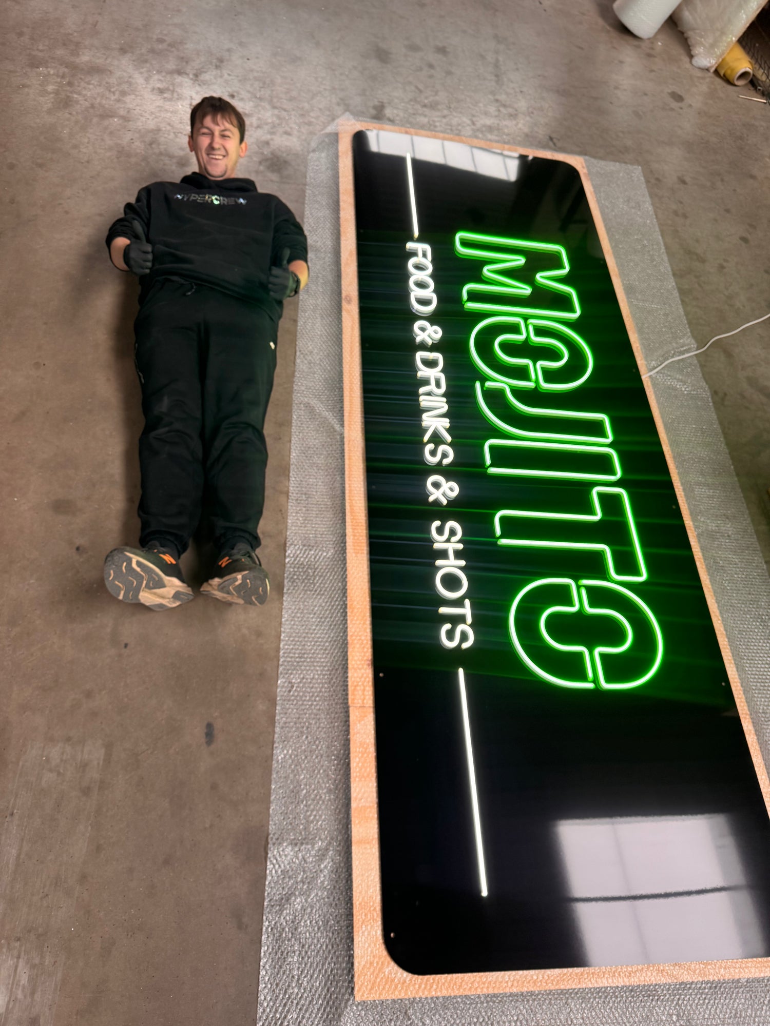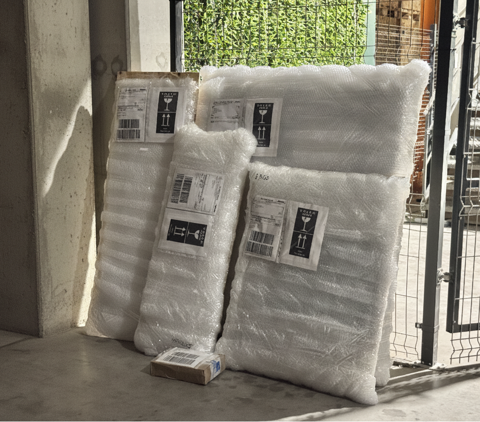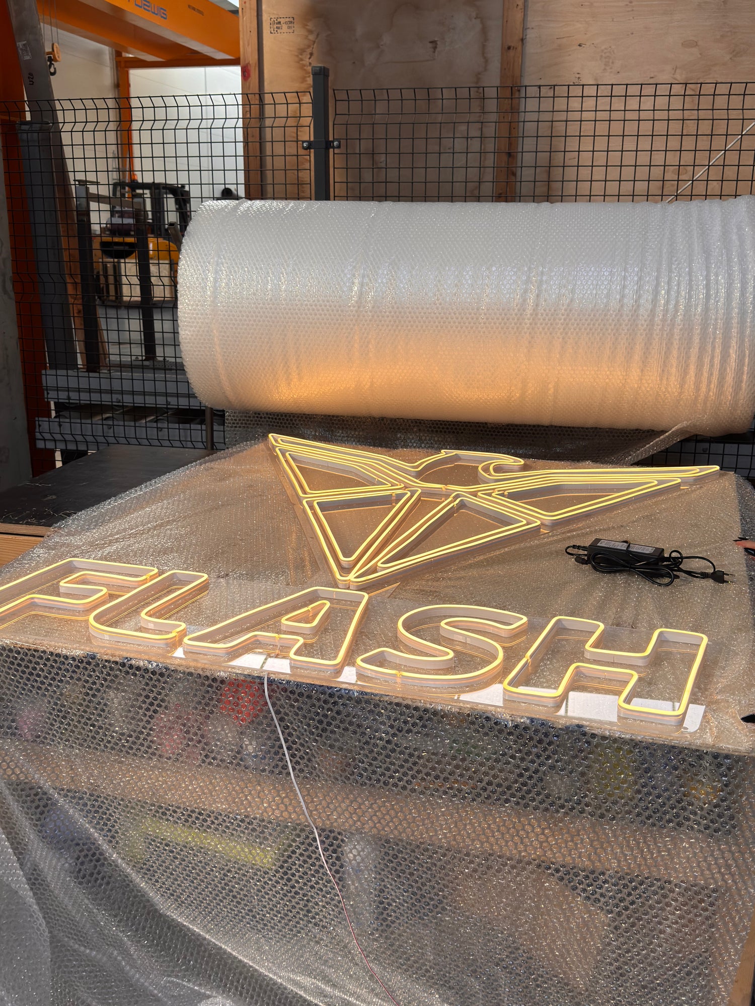 Nasze standardowe opakowanie dla neonu to drewniany podkład o grubości 9mm i folia bąbelkowa. Wysłaliśmy tak już ponad tysiąc paczek, wszystkie dotarły bezpiecznie na miejsce!